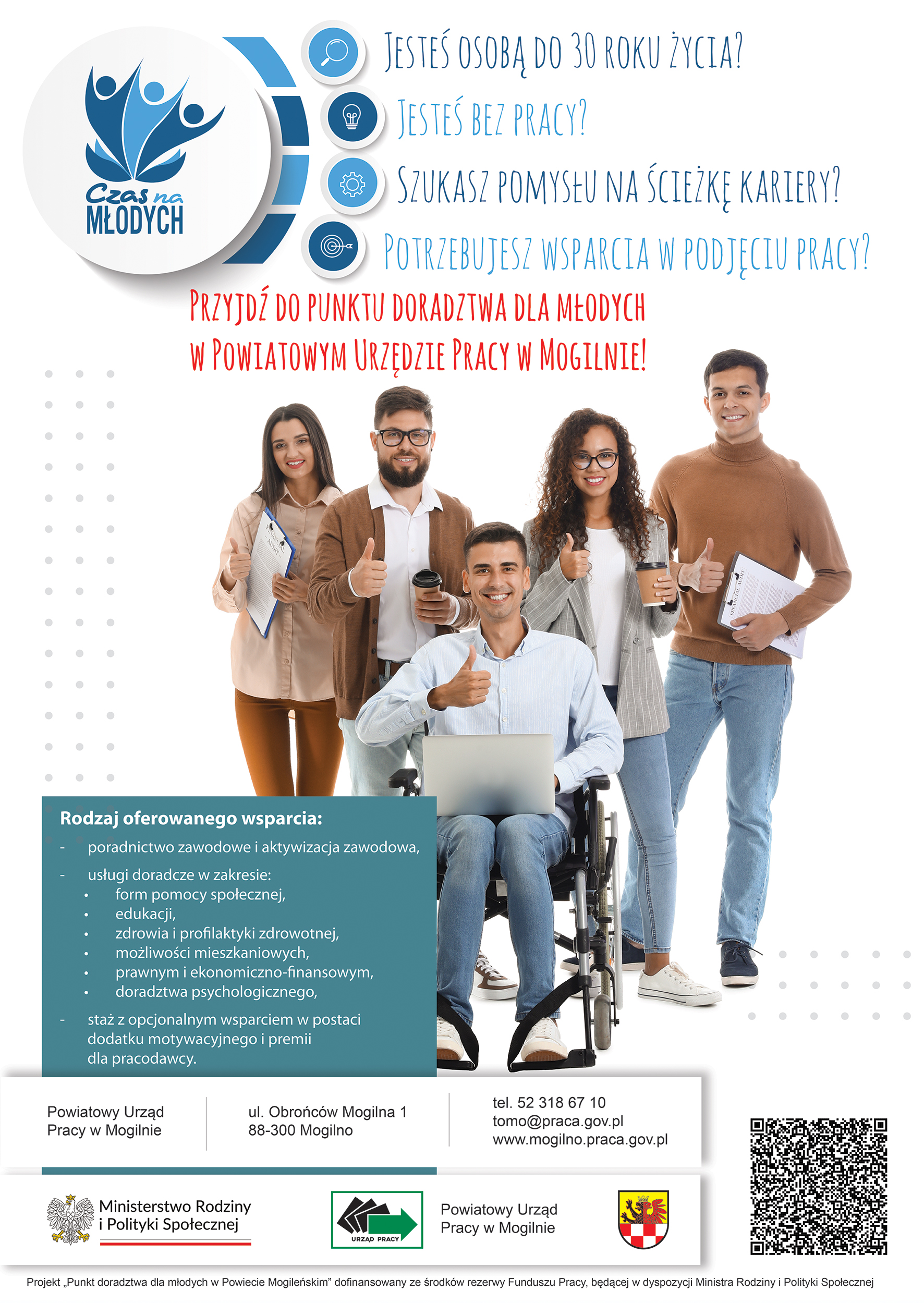 W dniu 15 grudnia 2023 r. w siedzibie Powiatowego Urzędu Pracy w Mogilnie nastąpiło rozpoczęcie działalności Punktu doradztwa dla młodych w Powiecie Mogileńskim, który powstał w ramach realizowanego od dnia 1 sierpnia 2023 r. projektu pilotażowego dofinansowanego ze środków Rezerwy Funduszu Pracy na podstawie naboru na projekty pilotażowe pod nazwą „Czas na Młodych – punkty doradztwa dla młodzieży".