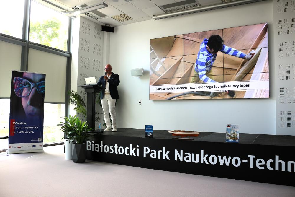 W swoim wystąpieniu „Na co to komu? Jaki jest sens zdobywania praktycznych umiejętności?” pan Maciej Ejdys, reprezentujący białostocką spółkę Archime, podzielił się z uczestnikami opowieścią o swojej drodze do sukcesu zarówno w życiu zawodowym, jak i prywatnym, o mocy marzeń, ale też o tym, dlaczego warto sobie najpierw zadać pytanie: „dlaczego?”.